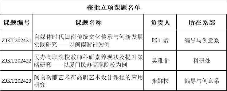 近日,厦门市教育科学研究院、厦门市职业技术教育中心公布“2024年厦门市职业教育研究课题”立项名单,我校编导与创意系邱叶龄《自媒体时代闽南传统文化传承与创新发展实践研究——以闽南游神为例》、编导与创意系张娜松《闽南砖雕艺术在高职艺术设计课程的应用研究》以及科研处吴雅菲《民办高职院校教师科研素养现状及提升策略研究——以厦门民办高职院校为例》三项课题获批立项。
